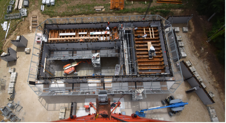 The demonstration replica building is being constructed in modular composite construction (MC2) to quantify the time and cost benefits of MC2 over reinforced concrete. The building is rectangular on plan (24.1 m x 12 m) and 14.94 m high. It is part of a project led by SCI, with partners EDF, CEA, EGIS, Bouygues, Peikko and ArcelorMittal and with funding from the European Commission's Research Fund for Coal and Steel and industrial sponsors ENRESA (Spain), Framatome, ORANO and ADF (France). The demonstration building is being constructed at Les Renardierès, Moret-Sur-Loing in France.